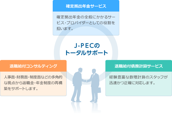 ジャパン・ペンション・ナビゲーター(J-PEC)は、退職給付から年金制度に関わる制度設計コンサルティング、退職給付債務計算、さらには、確定拠出年金の運営管理業務を中心とした新制度の導入支援、加入者サービスにいたるまで、トータルなサービスをご提供できる体制を整えています。