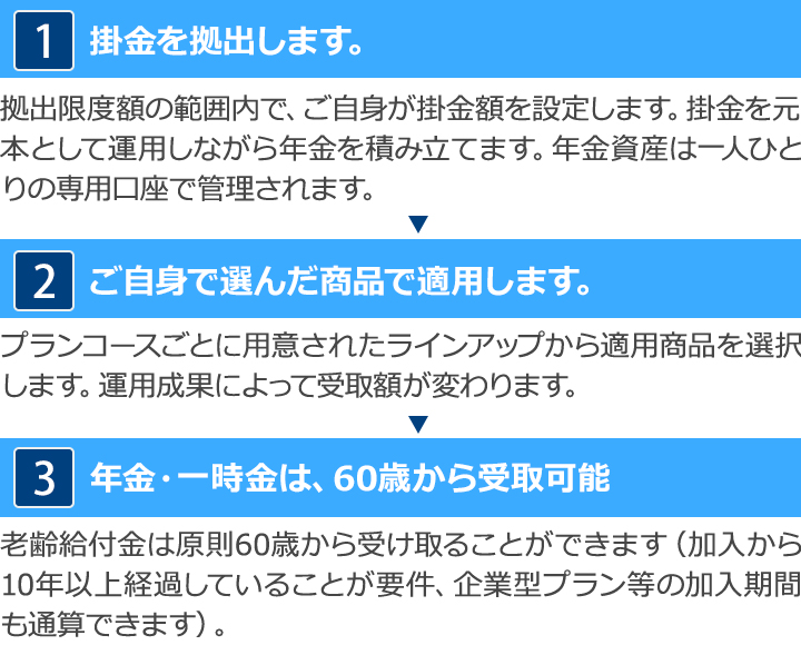 確定拠出年金は、(1)掛金を拠出して、(2)自分で運用し、